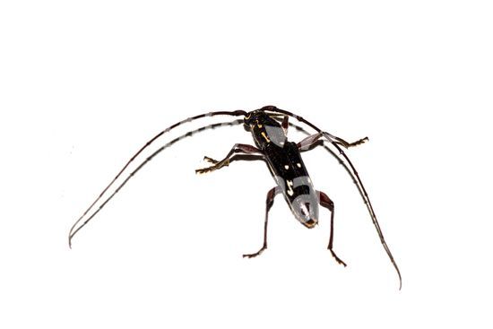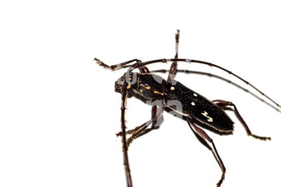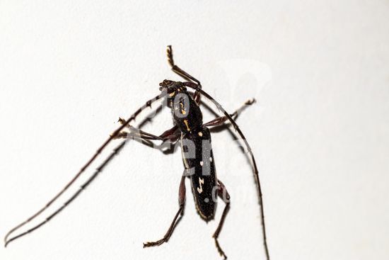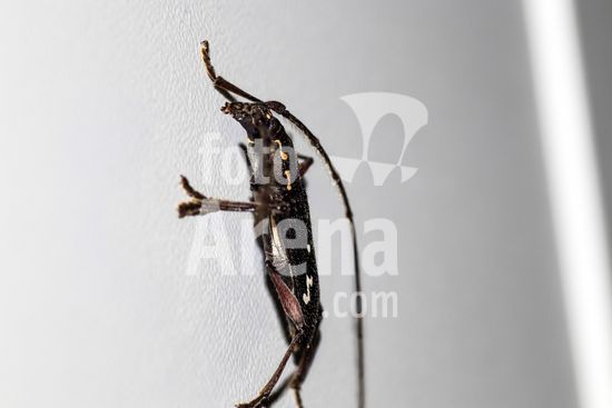 Ambonus interrogationis, uma espécie de besouro serra-pau encontrado no Brasil. Sua característica mais notável, que lhe confere o nome científico "interrogationis", é o desenho branco perfeitamente formado como um ponto de interrogação na parte posterior de suas asas rígidas (élitros). Este inseto, da família Cerambycidae, é um exemplo fascinante da diversidade e da "arte" encontrada na entomofauna neotropical. Além de sua aparência curiosa, ele desempenha um papel ecológico como decompositor, com suas larvas se desenvolvendo no interior de madeira. Estas fotografias de alta qualidade, com o inseto isolado, são um recurso visual inestimável de biologia e ciências, conceitos de mimetismo, identificação de espécies e a biodiversidade brasileira.