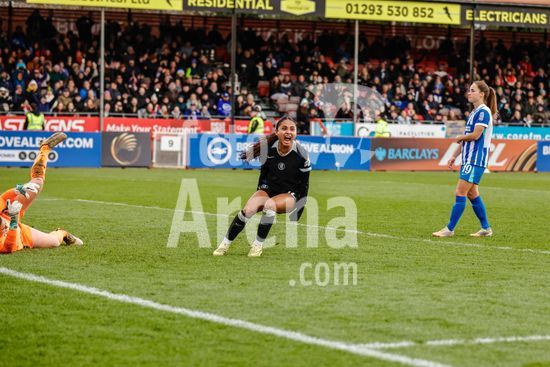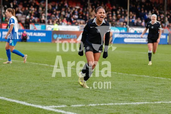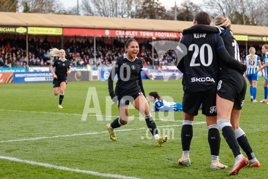 2859192 Alyssa Thompson (12 Chelsea) comemora seu gol durante a partida da Barclays Women's Super League entre Brighton & Hove Albion Women e Chelsea Women, no Broadfields Stadium, em Crawley, Inglaterra. (Neil Holmes/SPP)