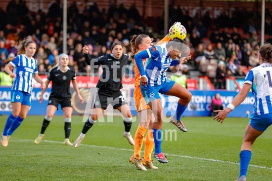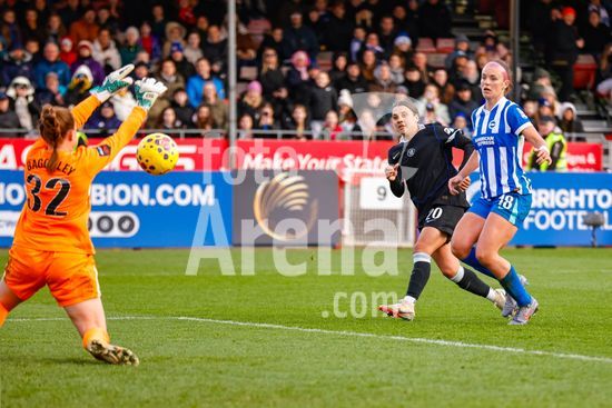2859184 Sophie Baggaley (32 Brighton & Hove Albion) faz uma defesa no chute de Sam Kerr (20 Chelsea) durante a partida da Barclays Women's Super League entre Brighton & Hove Albion Women e Chelsea Women, no Broadfields Stadium, em Crawley, Inglaterra. (Neil Holmes/SPP)