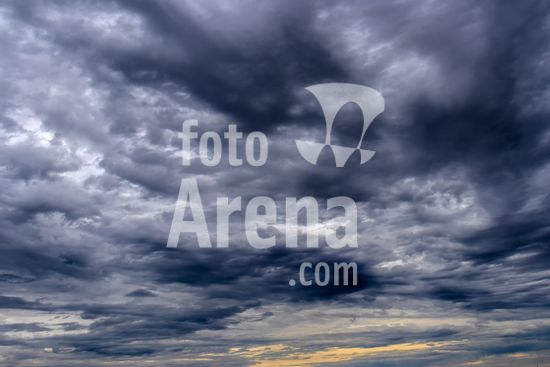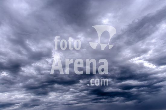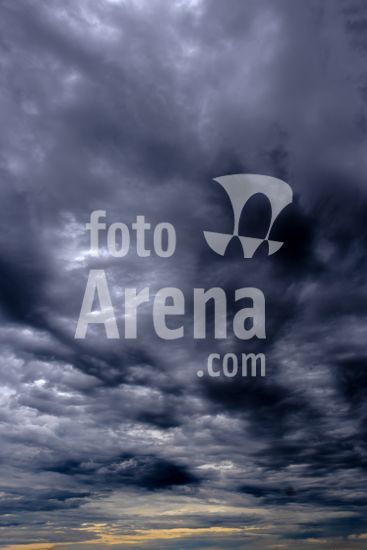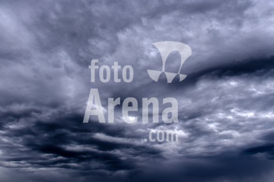 Céu carregado com nuvens escuras e densas, características de uma formação de tempestade sobrea a cidade de Marília, SP. Estas são nuvens do tipo Nimbostratus, que se formam em camadas baixas ou médias da atmosfera e são conhecidas por cobrir vastas áreas do céu, bloqueando a luz solar direta, como forte indicativo de instabilidade atmosférica, anunciando a chegada de precipitação, que pode variar de chuva contínua e moderada a tempestades com ventos fortes, permitindo ilustrar visualmente os diferentes tipos de nuvens, os fenômenos meteorológicos, as fases do ciclo da água e a dinâmica da atmosfera terrestre.