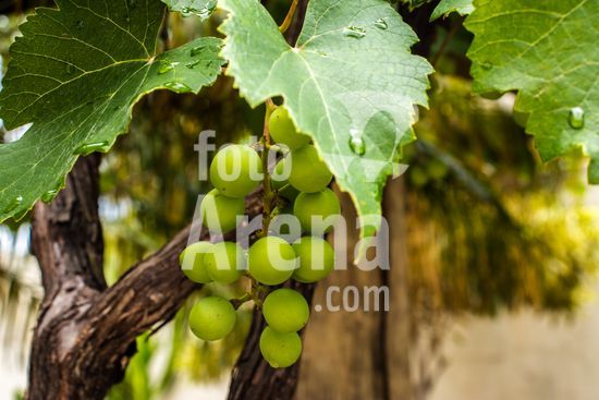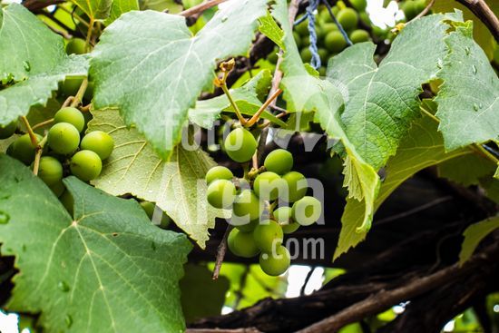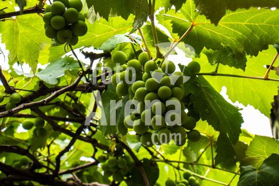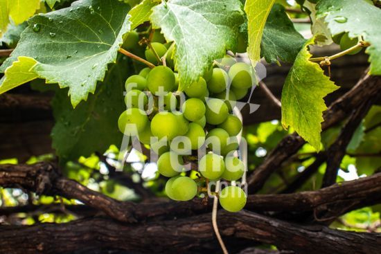 A imagem ilustra um cacho de uvas verdes na fase inicial de seu desenvolvimento, presas à videira na cidade de Marília, SP. Nesta etapa, conhecida como "bago de ervilha", os frutos ainda não atingiram a maturação completa, processo no qual acumularão açúcares, aumentarão de tamanho e, dependendo da casta, mudarão de cor. As gotas de água sobre as folhas da parreira indicam umidade recente, como orvalho ou chuva, que é essencial para o crescimento saudável da planta. A viticultura, ou o cultivo de uvas, é uma importante atividade agrícola no Brasil, especialmente nas regiões Sul e Sudeste, sendo fundamental para a produção de vinhos, sucos e para o consumo da fruta in natura.