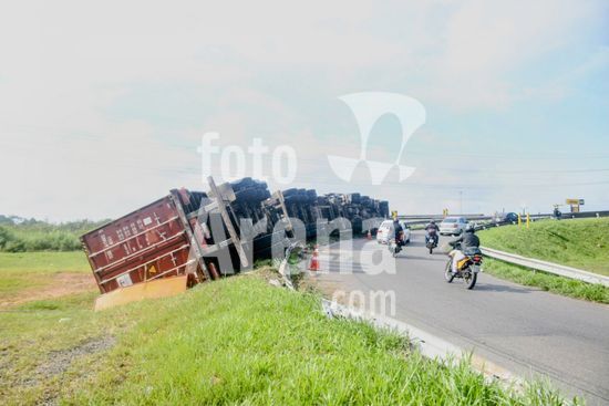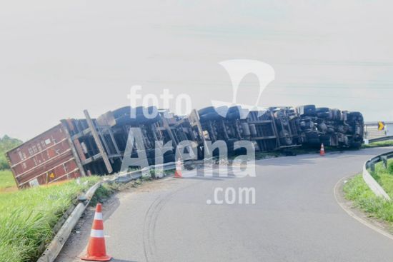 2848661 Carreta tomba na rotatória do viaduto do Cia, na manhã desta terça-feira (25), em Simões Filho, (BA). É a segunda carreta a capotar, no mesmo local, em menos de uma semana.