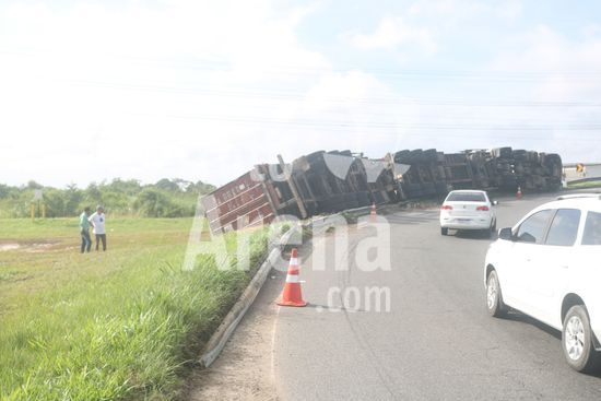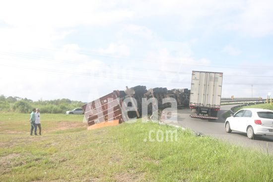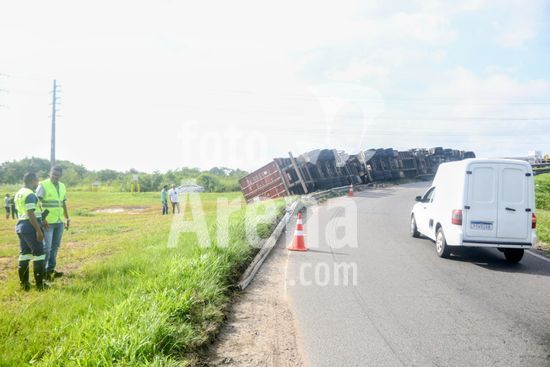 2848662 Carreta tomba na rotatória do Viaduto do CIA, em Simões Filho, município do estado da Bahia, na manhã desta terça-feira (25).