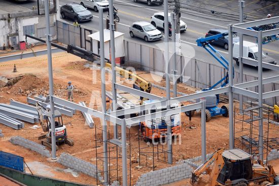 2772837 Construção Civil. Viga. Canteiro. Pedreiro. Trabalhador. Na foto, operários trabalham em obra, loja comercial em construção, Zona Oeste.