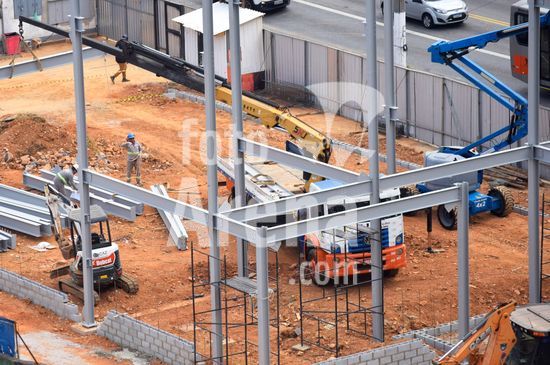 2772836 Construção Civil. Viga. Canteiro. Pedreiro. Trabalhador. Na foto, operários trabalham em obra, loja comercial em construção, Zona Oeste.