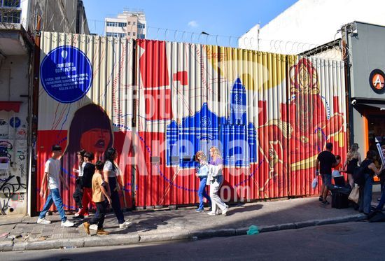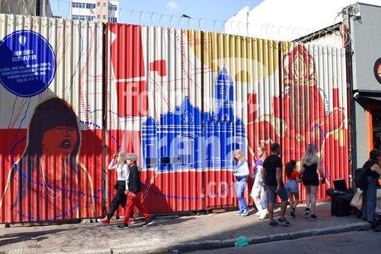 2539180 Teatro de Contêiner Mungunzá. Sede da Cia. Mungunzá de Teatro, localiza-se na região da Estação da Luz. Espaço cultural tem estrutura montada com a utilização de onze contêineres marítimos e além de sala de espetáculos, é usado também para exposições, shows e exibição de filmes. Na foto, lambe-lambe com personalidades da história e das artes.