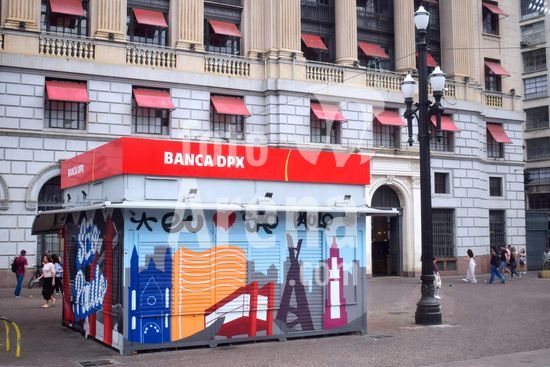 2793565 Banca de jornais no Viaduto do Chá, centro da capital. Grafite. Banca. Jornais.Fachada da banca exibe a frase Eu Amo São Paulo, e traz desenho de pontos turísticos, como Masp e Ponte Estaiada. Na foto, banca decorada e Shopping Light ao fundo.