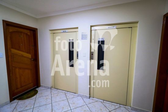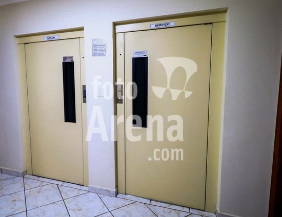 2851403 Elevadores contíguos com placas indicando social e serviço.