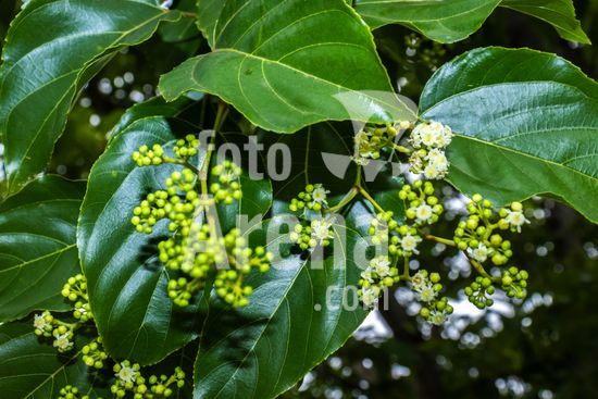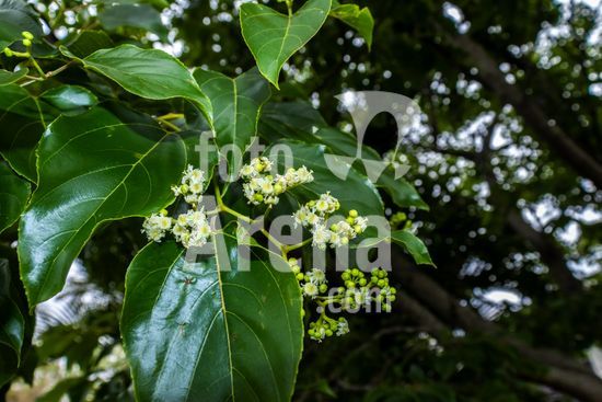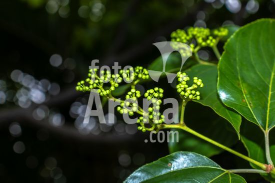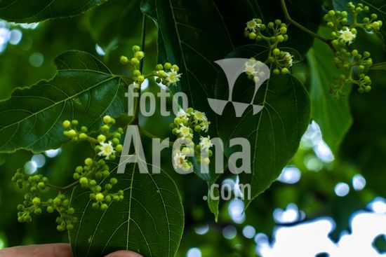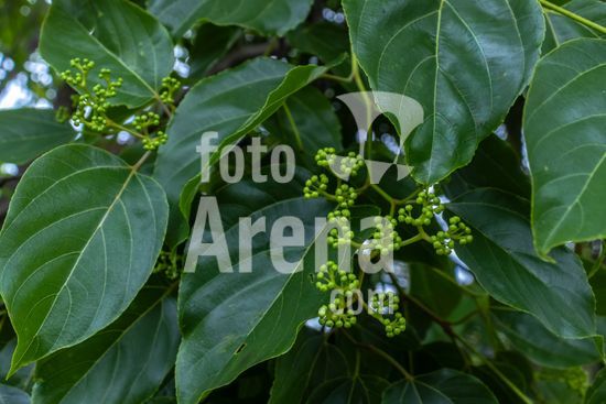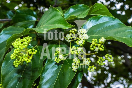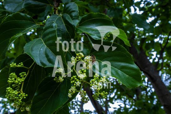 Detalhe da inflorescência da Uva-do-Japão (Hovenia dulcis), em uma chácara em Marília, SP. Uma árvore da família Rhamnaceae, originária da Ásia. A imagem destaca os cachos de botões florais esféricos e as pequenas flores brancas que desabrocham no verão. Embora suas flores sejam discretas, a espécie é mais conhecida pelos seus pseudofrutos: os pedúnculos (hastes das flores) que, após a floração, tornam-se carnosos, doces e comestíveis, com sabor semelhante ao de uma uva-passa, o que origina seu nome popular. Introduzida no Brasil, a Uva-do-Japão adaptou-se tão bem que hoje é considerada uma espécie exótica invasora em ecossistemas como a Mata Atlântica, competindo com a flora nativa e representando um desafio para a conservação da biodiversidade local.