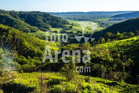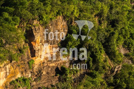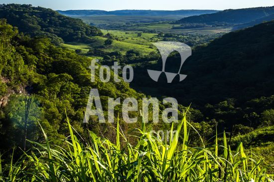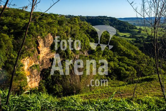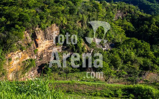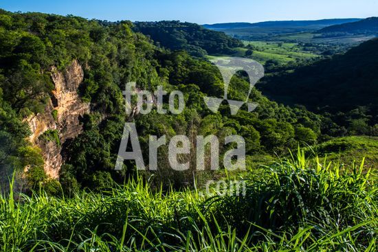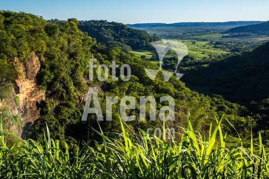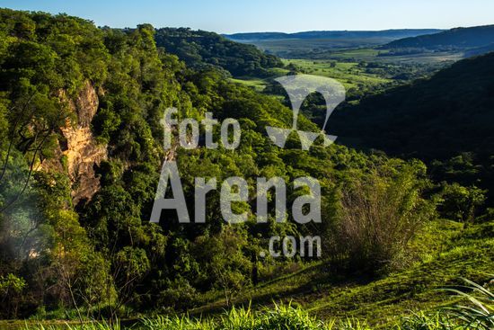 Itambé do Vale do Barbosa, uma imponente formação rochosa localizada no município de Marília, interior de São Paulo. O termo "itambé", de origem tupi, significa "penhasco", descrevendo perfeitamente a escarpa abrupta que domina a paisagem. Este cenário é representativo do relevo acidentado da região, parte do domínio dos "Mares de Morros", caracterizado por vales e morros esculpidos pela erosão ao longo de milhões de anos. A vegetação densa que cobre o vale e as encostas é um remanescente da Mata Atlântica, evidenciando a importância ecológica da área para a biodiversidade e a proteção dos recursos hídricos, como o Córrego do Barbosa. Embora não seja um termo técnico da geologia, como "cuesta" ou "falésia", "Itambé" é um nome popular e toponímico consagrado. Existem várias cidades e acidentes geográficos pelo Brasil com esse nome, quase sempre fazendo referência a uma formação rochosa proeminente na paisagem.Esta fotografia é um excelente recurso didático para ilustrar conceitos de geologia, geomorfologia, como relevo e erosão, e biomas brasileiros, além de documentar a beleza cênica e a riqueza natural do interior paulista.