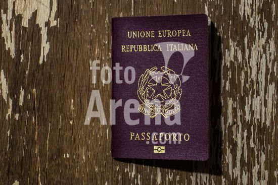 Detalhe da capa do passaporte biométrico da República Italiana em uma mesa na cidade de Marilia, SP.. Este documento oficial de viagem não apenas identifica seu portador como um cidadão italiano, mas também como um cidadão da União Europeia (UE). A cidadania italiana, e por consequência a europeia, é um direito buscado por milhões de brasileiros descendentes de italianos, pois garante o direito à livre circulação, residência, trabalho e estudo nos 27 países-membros da UE, além de facilitar a entrada em diversas outras nações. Ilustra conceitos de cidadania, nacionalidade, acordos internacionais (como o Espaço Schengen), e os processos migratórios contemporâneos ligados à herança cultural e globalização.