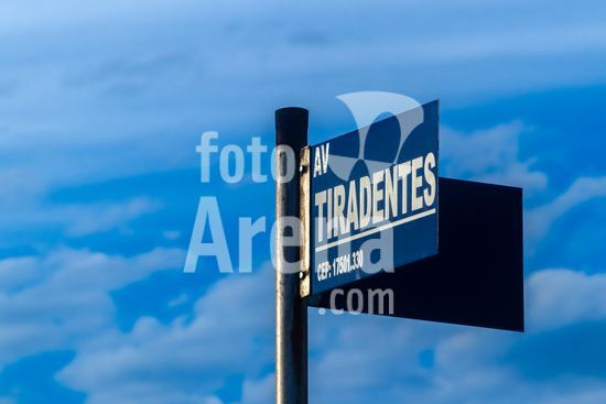 Placa da Avenida Tiradentes, na cidade de Marília, interior de São Paulo, se destaca contra um céu azul com nuvens. A imagem, com seu ângulo de baixo para cima, confere um tom de imponência ao nome de uma das mais importantes figuras da história do Brasil. Joaquim José da Silva Xavier, o Tiradentes, foi um mártir da Inconfidência Mineira (1789), um dos primeiros movimentos pela independência do Brasil do domínio português. Homenageado em ruas, praças e cidades por todo o país, seu nome em uma placa de rua como esta serve como um lembrete diário do passado e da luta pela liberdade, sendo um excelente recurso visual para ilustrar temas de história do Brasil, civismo, urbanismo e geografia.
