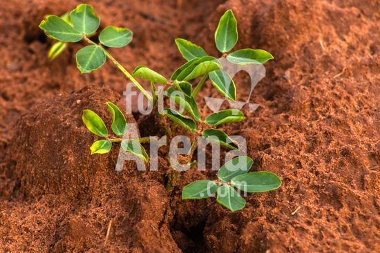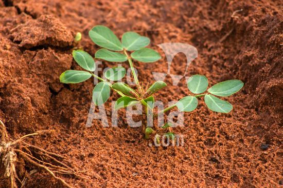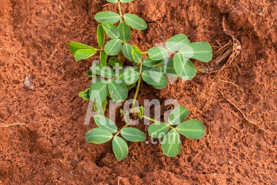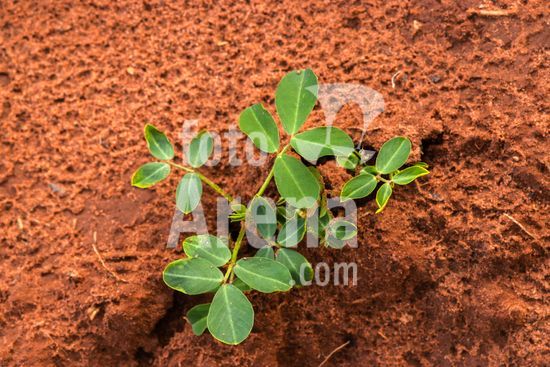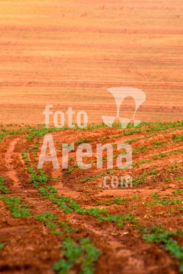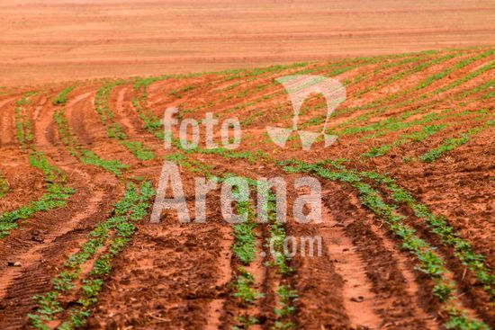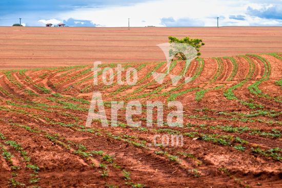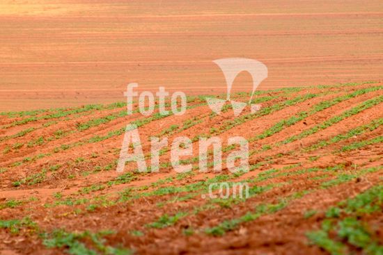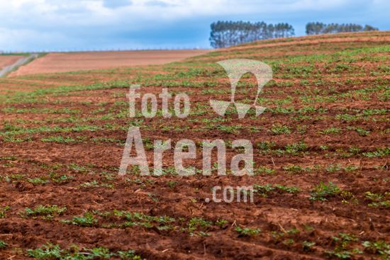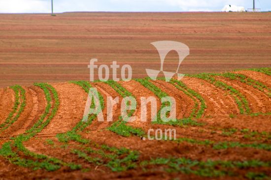 Plantação de amendoim (Arachis hypogaea) em estágio inicial de desenvolvimento, em uma propriedade agrícola na zona rural de Marília, SP. A imagem destaca a técnica de plantio em curvas de nível, em que as linhas de cultivo seguem as ondulações naturais do terreno. Este método de manejo é fundamental para a agricultura sustentável em áreas de relevo inclinado, pois diminui a velocidade de escoamento da água da chuva, combatendo a erosão e garantindo maior infiltração de água no solo.