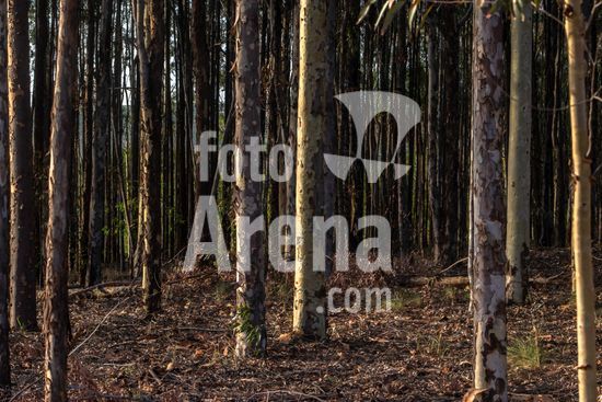 Uma plantação de eucaliptos revela seus troncos claros em meio à densa escuridão da floresta, em Marilia, SP. O eucalipto é amplamente cultivado para a indústria de papel e celulose e pode explorar temas como a monocultura, a importância econômica da silvicultura e seus impactos ambientais. O chão coberto de folhas secas e a ausência de outras espécies de plantas (sub-bosque) evidenciam a baixa biodiversidade característica desses cultivos, além do alto risco de incêndios florestais. A fotografia serve como um poderoso recurso visual para debates sobre desenvolvimento sustentável, manejo florestal e as complexas relações entre economia e meio ambiente no contexto brasileiro.