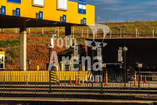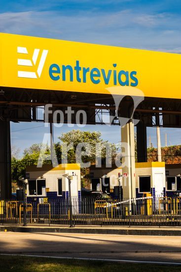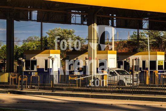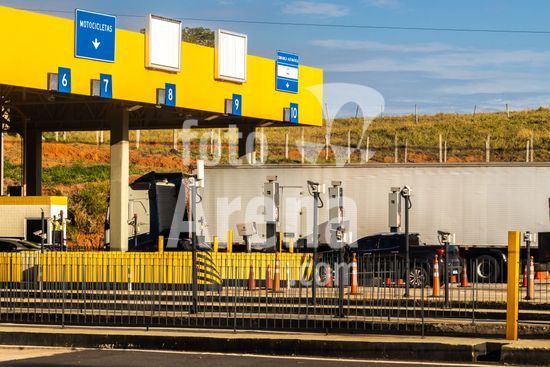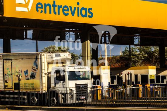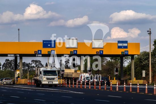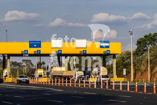 Praça de pedágio da concessionária Entrevias na rodovia Dona Leonor Mendes de Barros, SP-333, na altura da cidade de Marília, São Paulo. A imagem ilustra a importância do transporte rodoviário, principal modal logístico para a distribuição de mercadorias e abastecimento no Brasil. As praças de pedágio, administradas por concessionárias privadas, arrecadam dinheiro para a manutenção e modernização da infraestrutura das estradas, impactando diretamente nos custos e na eficiência da cadeia produtiva do país. Cenas como esta são representativas do fluxo econômico e da logística que movem a economia brasileira diariamente.