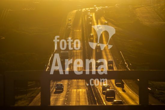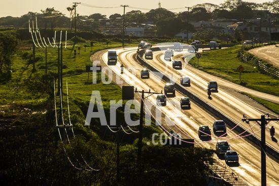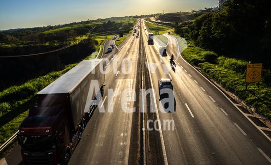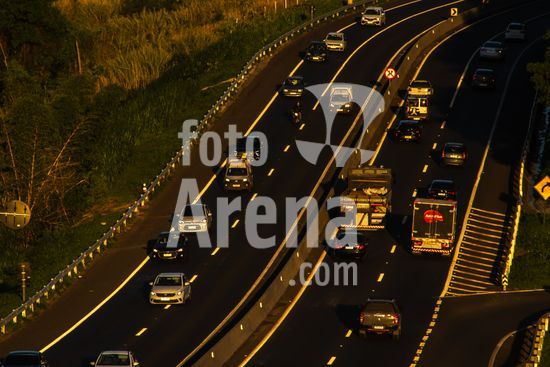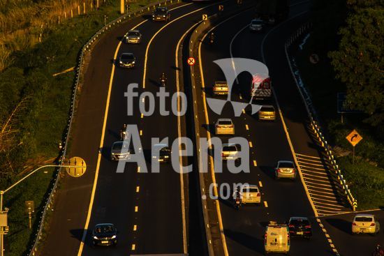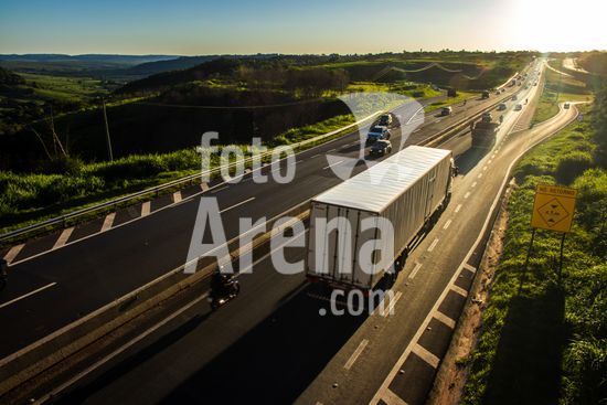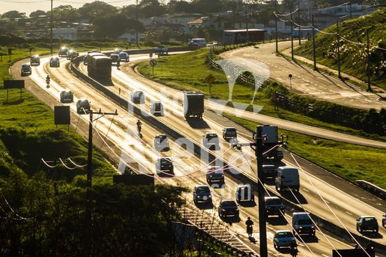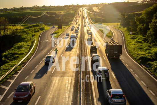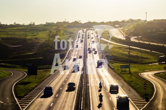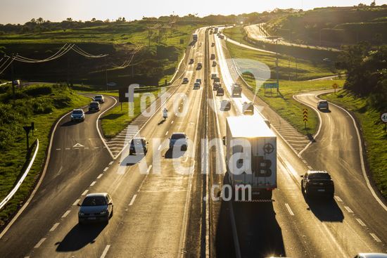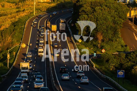 Vista da Rodovia Comandante João Ribeiro de Barros (SP-294), na altura da cidade de Marília, interior de São Paulo.A imagem retrata o intenso fluxo de veículos em um final de tarde na rodovia, um importante corredor logístico e de transporte que conecta diversas cidades da região. A luz dourada do sol poente ilumina a cena, destacando a movimentação de carros e caminhões que seguem em ambos os sentidos. Ao fundo, a topografia acidentada e a vegetação verdejante são características da paisagem local. Pode ilustrar temas como malha viária brasileira, transporte terrestre, desenvolvimento urbano e econômico, logística, fluxo de pessoas e mercadorias, e a relação entre infraestrutura e o ambiente. Em notícias, pode contextualizar o tráfego na região, desenvolvimento econômico, segurança viária ou questões ambientais.