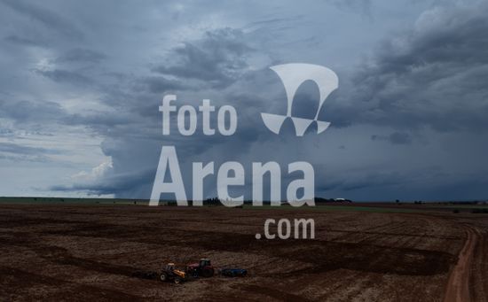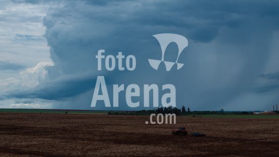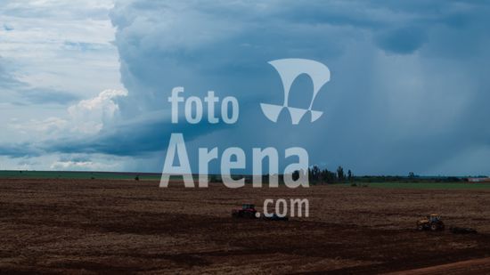 2841670 Sertãozinho- SP 08-11-2025. Um trator prepara a terra para o plantio ao lado de um grande nuvem de tempestade na zona rural de Sertãozinho, interior de São Paulo. Com a entrada do La ninha, temporais e tornados tem sido frequentes no sul e sudeste do país. Foto joel Silva