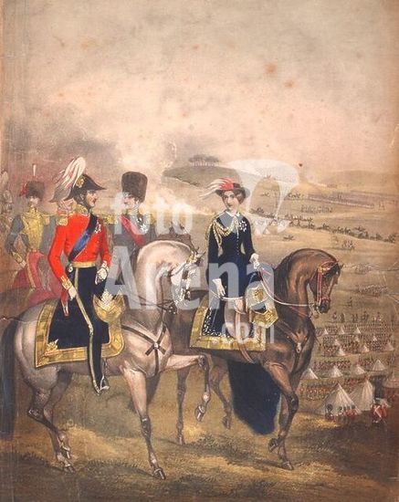 akg130212 Victoria, Queen of Great Britain and Ireland (1837-1901); 1819-1901. Manoeuvres of the 42nd Highlanders (fr l. Lord Cardigan, Prince Consort Albert, George V of Hanover, the Queen). Chalk lithograph, coloured, unattrib. Title page of the music piece: The Camp Polka / (...) by Cha (rle) s d'Albert, undated (London, c. 1852). Berlin, Sammlung Archiv für Kunst und Geschichte. Museum: Berlin, Sammlung Archiv für Kunst und Geschichte. Author: ANONYMOUS.
