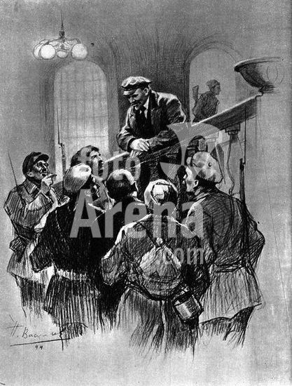 akg142224 Lénine, Vladimir Ilitch Oulianov, dit ; homme politique et théoricien révolutionnaire russe ; Simbirsk, auj. Oulianovsk. 22.4.1870 - Gorki, près de Moscou 21.1.1924. - Lénine discutant avec des Gardes Rouges à Petrograd. Dessin, de P. Vassiliev.