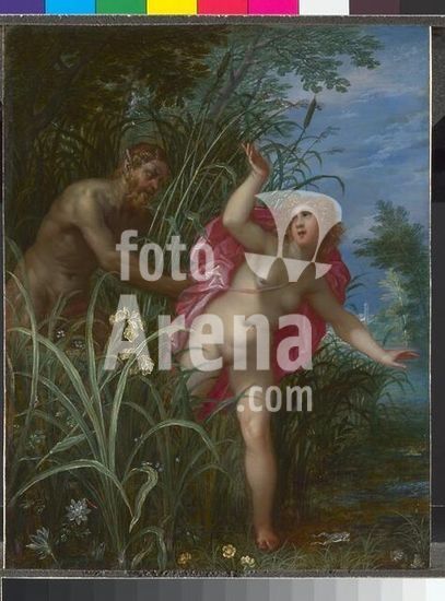 akg1557357 van BALEN the Elder, Hendrick; Dutch painter, 1575 (?) -1632. follower of Jan BRUEGHEL the Elder. "Pan pursuing Syrinx", possibly after 1615. (Thought to be a work in which Hendrick van Balen the Elder painted the figures, and the landscape was executed by a follower of Jan Brueghel the Elder). Oil on copper, 25 × 19.4cm. Inv. No. NG659. London, National Gallery. Museum: London, National Gallery. Copyright: Additional permissions needed for non-editorial use.