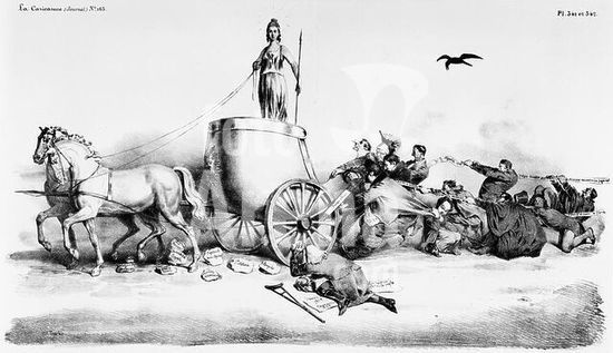 akg239842 Kingdom of July (reign of French King Louis Philippe, 1830-1848). "Il serait plus facile d'arrêter le soleil" (It would be easier to stop the sun; caricature: The King and notables try to stop the wagon of the republic). Lithograph, 1833, by Charles Louis Traviès de Villers (1804-59). From: La Caricature. (Journal) No. 163, Pl. 34. Berlin, Sammlung Archiv für Kunst und Geschichte. Museum: Berlin, Sammlung Archiv für Kunst und Geschichte. Author: CHARLES JOSEPH TRAVIES DE VILLERS.
