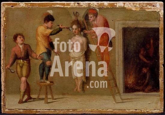 akg3335039 Alfani, Domenico; um 1479/80 - 1533. "Martyrium der Heiligen Juliana von Nikomedien: Die Heilige wird an den Haaren aufgehängt und mit flüssigem Blei begossen", 1532. Drittes Bild aus der Serie mit Szenen aus dem Leben der Heiligen Juliana von Nikomedien. Predella des Altarbildes aus der Kirche Santa Giuliana in Perugia. Öl auf Holz, 24 x 35 cm. Inv. Nr. 372. Perugia, Galleria Nazionale dell'Umbria. Museum: Perugia, National Gallery of Umbria. Author: DOMENICO DI PARIDE ALFANI.