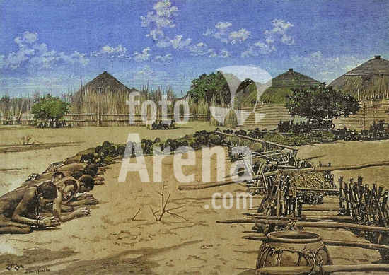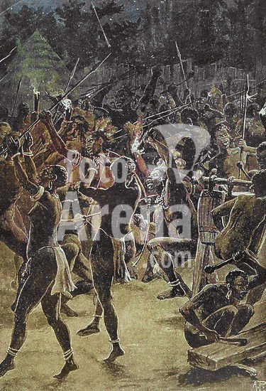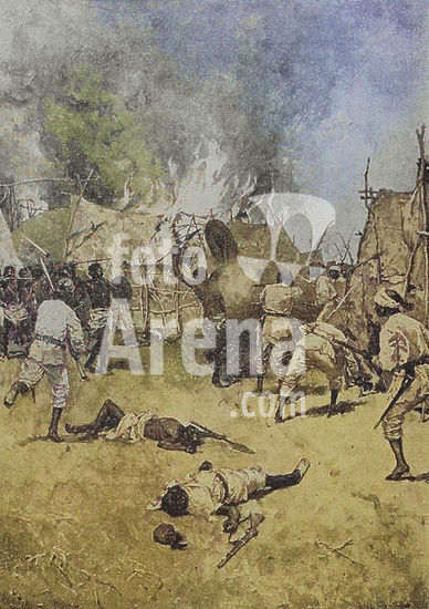 alb23634592 Exploration of Central Africa. First expedition (1861-1865) by British explorer Samuel White Baker (1821-1893). Attack on a village during Sir Samuel Baker's expedition. Photogravure. Colorised.