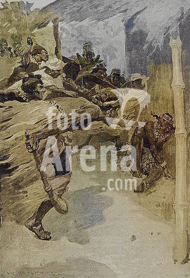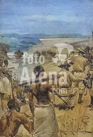 alb23634596 Africa, 19th century. Naval battle between the Waganda and the Wavuma. Over the years, the kings of Uganda tried in vain to subdue the Wavuma, who refused to accept Christianity. King Mutesa resolved to subjugate the islands in 1875, causing a deterioration in relations between Buganda and Buvuma. At this time, Henry Morton Stanley was staying in Uganda during his expedition to the Congo River (1874-1877), describing the fighting force with which Mutesa attempted to conquer the Wavuma. Photogravure after an illustration by William Heysham Overend (1851-1898). Colorised. Author: William Heysham Overend (1851-1898). British marine artist and book illustrator.