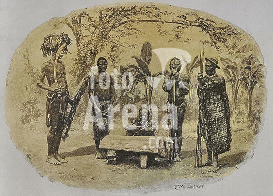 alb23634599 Africa, 19th century. Matotela offering tribute to the Barotse King. Photogravure from a photograph taken for the Paris Society for Evangelical Missions. Colorised.