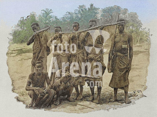 alb23634597 Mozambique. Wa-Yao hunters. 19th century. Photogravure from photograph by the Universities' Mission to Central Africa. Colorised.