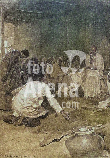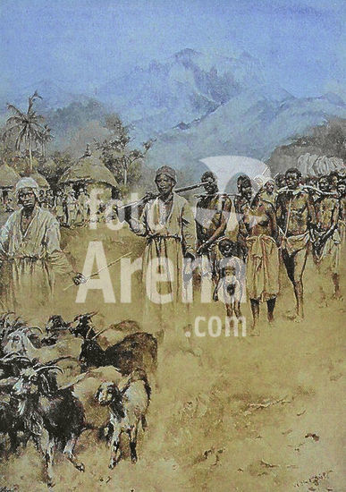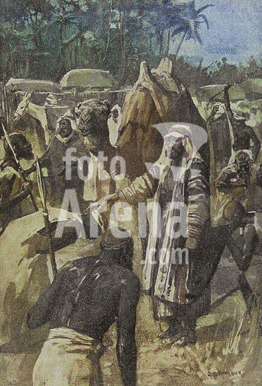 alb23634593 Africa, 19th century. Job was the son of a Fulani chieftain who assumed the attributes of a sovereign in the region of Bondou, located between the Gambia and Senegal. Having been sent on business to the banks of the Gambia, his father strictly forbade him from crossing the river so as not to fall into the hands of the Mandinka, who were his worst enemies. Curiosity led him to disobey orders, and he fell into the hands of the Mandinka, who surprised him while he was sleeping. He was taken to Joar, where he was sold as a slave to Captain Pyke, who had orders to transport a shipment of slaves to the plantations of America. Job, "son of Solomon", surprised by a party of Mandingoes. Illustration by W. Hatherell (1855-1928). Photogravure. Colorised. Author: William Hatherell (1855-1928). English painter and illustrator.