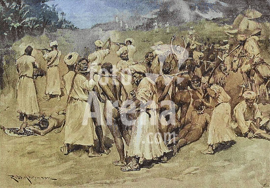 alb23634600 Raids for slaves by the Moors. Africa. 19th century. Photogravure after an illustration by R. Atkinson. Colorised.