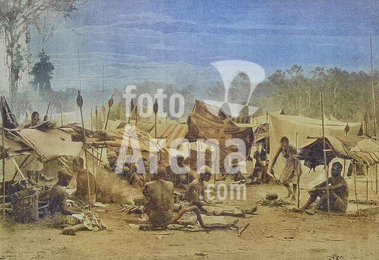 alb23634601 Africa. Encampment of boatmen in the Gaboon country. 19th century. Photogravure by André & Sleigh. Colorised.
