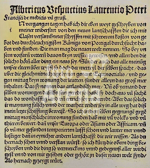 alb23634602 Amerigo Vespucci (1454-1512). Florentine merchant, explorer and navigator. Facsimile of a page from the German edition of the letter written by Amerigo Vespucci to Lorenzo di Pierfrancesco de' Medici (1463-1503), sent to Florence from Lisbon in 1502. In it, he related his third voyage (1501-1502), in which he entered the service of the Portuguese, whose expedition set sail on 10 May 1501. Colorised.