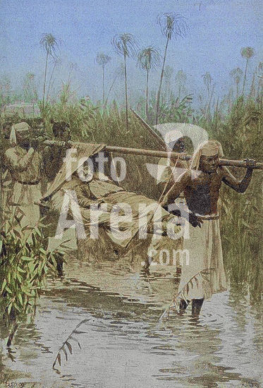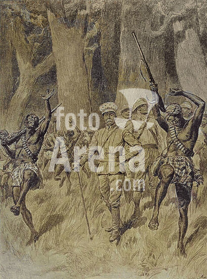 alb23634749 Africa, 19th century. Emin Pasha Relief Expedition (1887-1889). The advance column of the expedition emerging from the Aruwimi forest. Photogravure. Colorised.