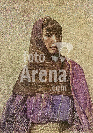alb23634604 Portrait of a young Bedouin bride from the Senagrah tribe, wearing a party dress. Libyan Desert, Sudan. 19 th century. Photogravure. Colorised.
