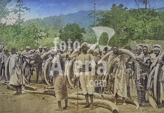 alb23634609 Africa. Elephant tusks brought from the inland by Captain Lugard. Dualla, a famous caravan leader, in the foreground. 19th century. Photogravure by André & Sleigh. Colorised.