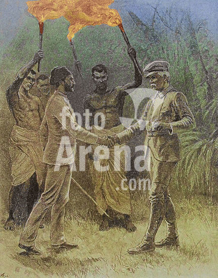 alb23634750 Africa, 19th century. Emin Pasha Relief Expedition (1887-1889). Meeting of Emin Pasha (1840-1892) and Henry Morton Stanley (1841-1904) at Kavalli, 29 April 1888. Photogravure. Colorised.