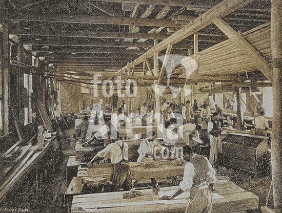 alb23634752 South Africa, 19th century. Lovedale, also known as Lovedale Missionary Institute. Mission station founded in 1824 by the Glasgow Missionary Society (GMS), named in honour of Dr John Love (1757-1825), one of the leading members and at the time secretary to the society. Carpentry workshop at Lovedale. Photogravure by André & Sleigh. Colorised.