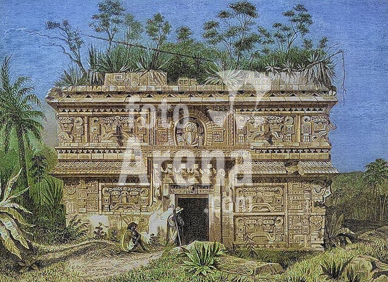 alb23634753 The Nun's House (La Casa de las Monjas). Chichen Itza, State of Yucatan, Chichen Itza, Mexico. Engraving. Colorised.