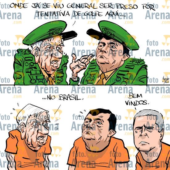 NAN2512057859 NANDO MOTTA, EPISÓDIOS SOCIAIS E POLÍTICOS, REDES SOCIAIS, 27/11/2025.Generais presos.Representação de General Heleno, Paulo Sérgio Nogueira e Braga Netto.- Onde já se viu general ser preso por tentativa de golpe aqui no Brasil.- Bem vindos.